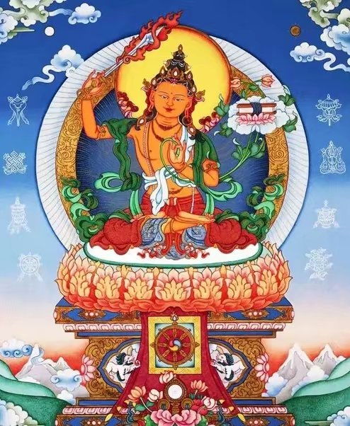 文殊菩萨是佛教中的智慧菩萨,被尊奉为智慧的象征。他的法身通常被描绘为持有一本经典和一朵莲花,象征智慧和觉悟。文殊菩萨以智慧和慈悲为主要修行,他的咒语被认为能够帮助人们获得智慧和灵感。